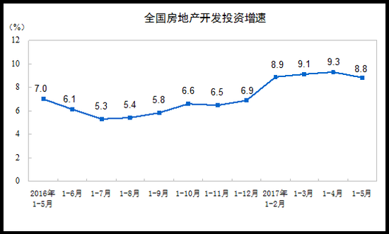 2017年1-5月份,全國房地產開發投資37595億元,同比名義增長8.8%,增速比1-4月份回落0.5個百分點。其中,住宅投資25423億元,增長10.0%,增速回落0.6個百分點。住宅投資佔房地產開發投資的比重為67.6%。