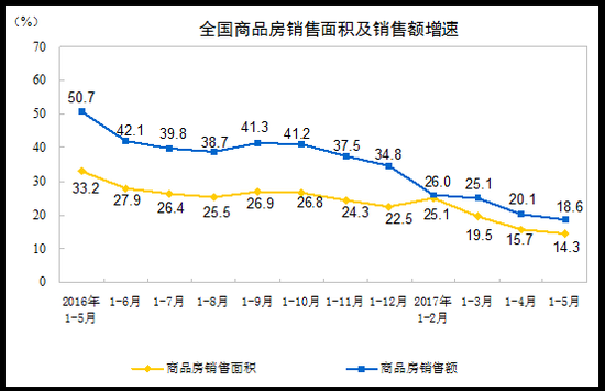 1-5月份,商品房銷售面積54820萬平方米,同比增長14.3%,增速比1-4月份回落1.4個百分點。其中,住宅銷售面積增長11.9%,辦公樓銷售面積增長38.3%,商業營業用房銷售面積增長29.6%。商品房銷售額43632億元,增長18.6%,增速回落1.5個百分點。其中,住宅銷售額增長15.3%,辦公樓銷售額增長37.4%,商業營業用房銷售額增長39.0%。