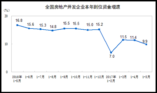 1-5月份,房地產開發企業到位資金58989億元,同比增長9.9%,增速比1-4月份回落1.5個百分點。其中,國內貸款10497億元,增長17.3%;利用外資90億元,增長115.1%;自籌資金18008億元,下降3.4%;其他資金30394億元,增長16.7%。在其他資金中,定金及預收款17849億元,增長20.3%;個人按揭貸款9600億元,增長8.6%。