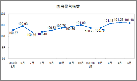 5月份,房地產開發景氣指數(簡稱“國房景氣指數”)為101.18,比4月份回落0.05點。