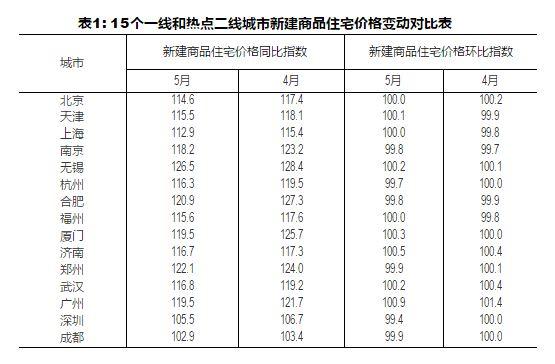 在國家統計局重點監控的15個一線和熱點二線城市新建商品住宅價格環比指數中,5月份,有6個城市新建商品住宅價格環比上漲,與上月個數持平,分別是天津、無錫、廈門、濟南、武漢、廣州,其中廣州的環比漲幅最大,為0.9%;另外,北京、上海、福州的環比房價持平;南京、杭州、合肥、鄭州、深圳、成都這五個城市的環比房價漲幅均呈現回落的狀態,其中,深圳房價環比跌幅為0.6%。