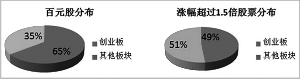百元股陣營一直被視為牛市財富效應驕傲象徵和誘人結晶。截至3月25日收盤,A股兩市共有34只百元股,其中有22只屬于創業板。