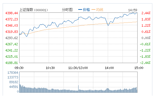 周二兩市開盤雙雙高開,開盤後滬指一度走低,盤中題材權重集體崛起,帶動滬指大漲逾1%,創業板強勢站上2600點,再創歷史新高;盤中一度大漲近4%,之後衝高回落,臨近午盤,滬指再度拉升漲近2%,最高漲至4369.90點,再創七年來新高。滬指午後高位震蕩後略有回落,漲幅一度收窄,隨後電力、煤炭集體爆發,股指重新上行,臨近尾盤,券商股接力暴漲,滬指大漲2.5%刷新日內高點,劍指4400點。截至收盤,滬指報4399.49點,漲2.44%,盤中一度站上4400點,兩市成交額再次破1.6萬億,其中滬指逼近1萬億。個股方面,兩市逾2000只股飄紅,僅118只股下跌,超百只股漲停。