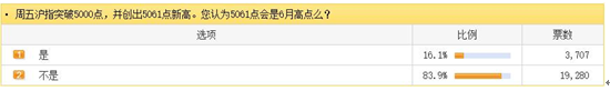 據東方財富網調查顯示,截至發稿,共有22992人參加調查,其中有83.9%的投資者認為,六月滬指仍將再創新高;有16.1%的投資者認為,5061點將會是6月高點。