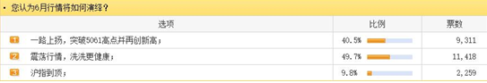 對于6月行情將如何演繹,有40.5%的投資者認為將一路上揚,突破5061高點並再創新高;有49.7%的投資者認為震蕩行情,洗洗更健康;9.8%的投資者認為滬指已到頂。