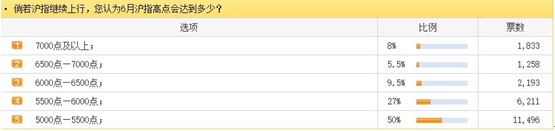 在“倘若滬指繼續上行, 6月滬指高點會達到多少?”的調查中,50%的投資者選擇滬指將在5000點—5500點間徘徊;27%的投資者認為將在5500點—6000點之間;9.5%的投資者稱將在6000點—6500點;13.5%的投資者認為滬指將突破6500點大關。