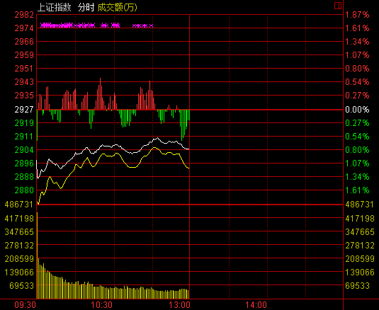 周一兩市雙雙跳空低開,滬指失守2900點後最低探至2886.30點,隨後展開低位震蕩,盤中黃金概念、上海自貿等個別板塊表現活躍,市場成交量依舊沒有起色,避險情緒升溫。截至午盤,滬指報2904.23點,跌幅0.78%,成交872億元;深成指報10216.84點,跌幅0.97%,成交1846億元;創業板指報2153.51點,跌幅1.51%,成交584億元。