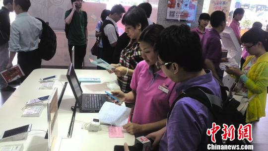 4月28日,支付寶與中國電信廣州分公司(以下簡稱“廣州電信”)合作的余額寶“0元購機享收益”項目正式上線,圖為顧客在現場咨詢。 唐貴江 攝