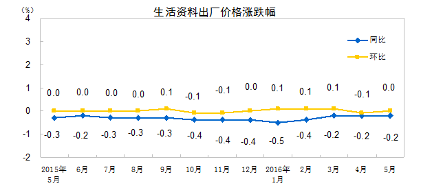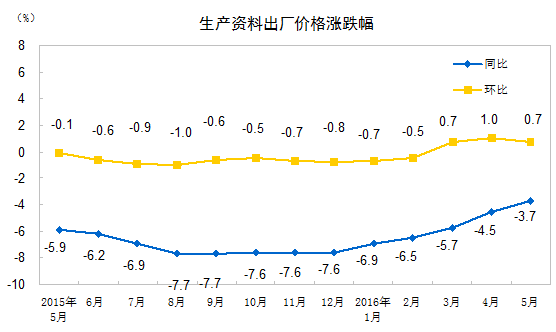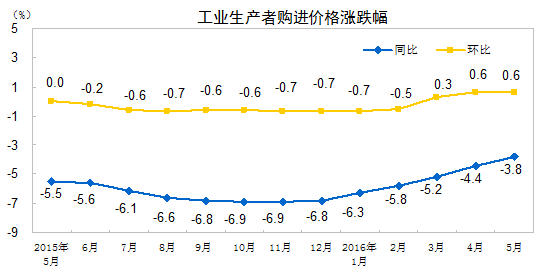 2016年5月份,全國工業生產者出廠價格環比上漲0.5%,同比下降2.8%。工業生產者購進價格環比上漲0.6%,同比下降3.8%。1-5月平均,工業生產者出廠價格同比下降4.1%,工業生產者購進價格同比下降5.1%。