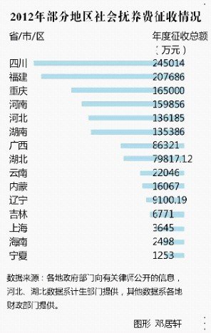迄今已經五十來天,吳有水陸續收到了大半的回函。截至目前,共有15個省的財政廳及計生係統將社會撫養費2012年的收繳金額予以反饋。收入總額總計約128億元,其中四川省財政此項收入最高,為24億元。