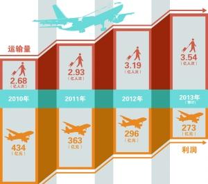 昨日閉幕的2014年全國民航工作會議暨航空安全會議傳出消息,預計今年民航全行業實現利潤總額為273億元,而據民航局歷年公布的數據,民航全行業利潤自2010年達到巔峰值434億元之後,已經連續三年下降。與之相反的是,年運輸總周轉量、旅客運輸量則呈逐年遞增態勢。 (CFP/供圖)