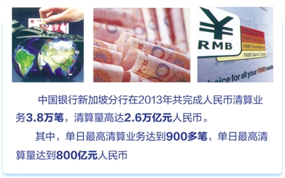 本報新加坡電 記者陶傑報道:中國工商銀行新加坡分行提供的最新數據顯示,由工行新加坡分行擔當的新加坡人民幣業務清算行,在2013年共完成人民幣清算業務3.8萬筆,清算量高達2.6萬億元人民幣。其中,單日最高清算業務達到900多筆,單日最高清算量達到800億元人民幣。