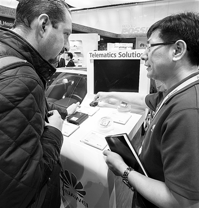 在2014年拉斯韋加斯國際消費電子展上,人們關注華為公司推出的4G車用通訊互聯模塊。