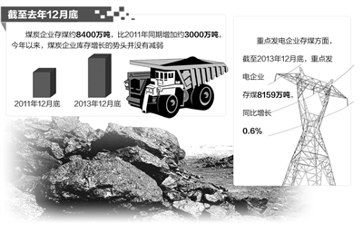 更嚴峻的是,庫存高企不僅限于碼頭,而且已在煤炭企業和用煤大戶的產業鏈條上傳導開來。中經煤炭產業景氣指數監測結果顯示,截至2013年四季度末,煤炭產業產成品資金同比增長11.8%,較上季度加快1.4個百分點。來自中國煤炭工業協會的數據也表明,截至去年12月底,煤炭企業存煤約8400萬噸,比2011年同期增加約3000萬噸。今年以來,煤炭企業庫存增長的勢頭並沒有減弱。