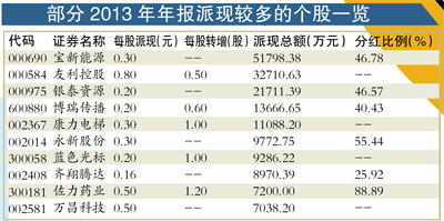 同花順數據顯示,截至2014年2月16日,A股累計有99家上市公司發布了2013年年報利潤分配預案。記者對比發現,同2012年相比,現金分紅的公司佔比有增加趨勢,其中,去年年報準備給股東派現現金紅包的公司達到87家,佔比為87.88%。如果按照分紅基準股本計算,合計分紅金額預計將達到37.54億元。而在已發布年報的上市公司中,有15家公司現金分紅比例超過30%。