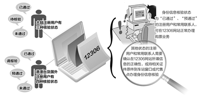 實施身份信息核驗後,在12306網站上使用二代居民身份證的注冊用戶和常用聯係人身份信息將有“已通過”、“待核驗”、“未通過”3種核驗狀態,使用護照、港澳居民來往內地通行證、臺灣居民來往大陸通行證的注冊用戶和常用聯係人身份信息將有“已通過”、“請報驗”、“預通過”、“未通過”4種核驗狀態。身份信息核驗狀態為“已通過”、“預通過”的注冊用戶和常用聯係人,可在12306網站正常辦理購票業務;其他狀態的注冊用戶和常用聯係人需要確認在12306網站所填信息的正確性,或持相關證件原件到車站窗口或代售點辦理身份信息核驗。