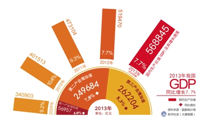 公報顯示,過去一年我國產業、區域、城鄉等經濟結構均有所改善。第三產業比重首次超過第二產業,達到46.1%。與此同時,居民收入水平持續提高:2013年全國居民人均可支配收入為18311元,同比實際增長8.1%;農村和城鎮居民恩格爾係數分別為37.7%和35%,分別比上年下降1.6個和1.2個百分點。