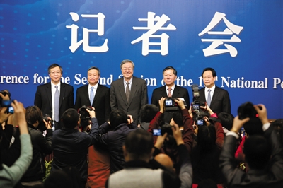 昨日,周小川(中)、尚福林(右二)、肖鋼(左二)、項俊波(右一)、易綱(左一)出席記者會。