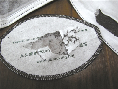 “九頭鷹納米PM2.5口罩”撕開的濾芯,兩層無紡布之間,填充有很多顆粒狀活性炭,但不均勻。經第三方檢測,這款口罩的防霾效果,連其所宣傳效果的一半都達不到。