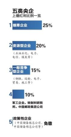 我國從2007年開始央企上繳國有資本收益的試點工作,當時規定,石油石化、電力、電信、煤炭等資源型企業按凈利潤的10%上繳;鋼鐵、運輸、電子、貿易、施工等一般競爭類企業按凈利潤的5%上繳;軍工企業、轉制科研院所等暫緩3年上繳。