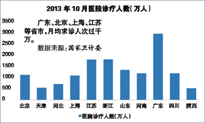 2013年12月9日,國家衛計委在其官網上發布了當年10月各省醫院和鄉鎮衛生院的統計數據。當月去醫院求醫的診療人數,廣東以2899.4萬人次居首,而排名第二的浙江,診療人數僅為1781.7萬人次,第一名和第二名之間竟拉開了1100萬人次的差距,幾乎“完爆”。而其他地區中,江蘇是1772.4萬人次,北京是1101.3萬人次,上海是1074.2萬人次。可見,在廣東醫院看病的人,幾乎是江蘇和上海兩地求診人數的總和。