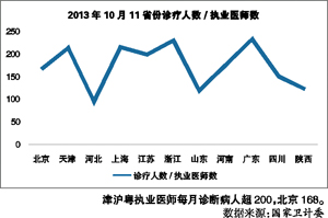 同時,北京看病同樣難。在2013年10月,每一個北京執業醫師要看168個病人。