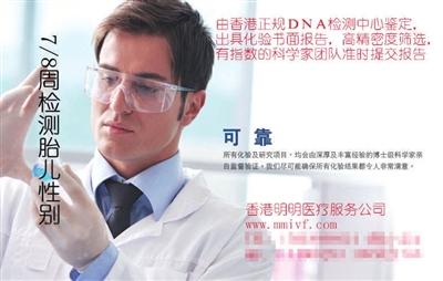 另外,雖然抽血鑒別胎兒性別的準確率在98%以上,但仍然有2%左右的失誤。記者就此問題與謝女士溝通時,她坦言,如果出現失誤,只能是孕婦家庭自認倒霉,“找我也沒用啦,因為不是我檢測的,報告也不是我出的,要維權你就得到香港找那家檢測中心去啦。”