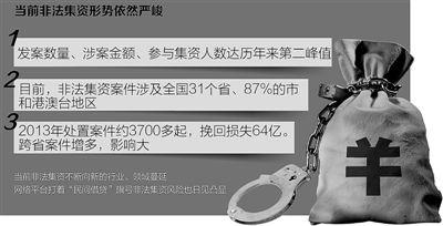 處置非法集資部際聯席會議今天發布《關于辦理非法集資刑事案件適用法律若幹問題的意見》,同時指出當前非法集資形勢依然嚴峻,發案數量、涉案金額、參與集資人數繼續處于高位,達歷年來第二峰值。非法集資案件涉及全國31個省(區、市)、87%的市(地、州、盟)和港、澳、臺地區。據統計,2013年處置案件大概有3700多起,挽回損失64億。新發案件更多地集中在中東部省份,跨省案件增多,影響較大,並不斷向新的行業、領域蔓延。處置非法集資部際聯席會議辦公室主任劉張君提醒社會公眾,非法集資不受法律保護,參與非法集資風險自擔。