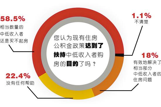 “您認為現有住房公積金政策達到了扶持中低收入者購房目的了嗎?”調查顯示,58.5%的人稱“效果不明顯,差強人意”,18.0%的人認為“有效地解決了相當部分的中低收入者的住房問題”。