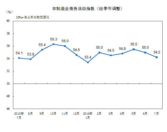 2014年7月,中國非制造業商務活動指數為54.2%,雖比上月回落0.8個百分點,但仍高于榮枯線4.2個百分點。