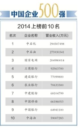 據悉,中國企業500強榜單已連續發布13次。數據顯示,2014年中國企業500強實現營業收入56.7萬億元,較上年的50.02萬億元增長了13.31%,增速較上年提高1.90個百分點。中石化、中石油、國家電網3家企業的營業收入均超過2萬億元。其中,中石化以營業收入29450.7億元連續10年領跑。
