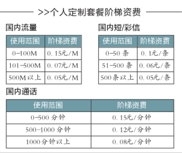 在4G放號的同時,中國電信還推出了一款“個人定制套餐”,主打“不浪費、不後悔”的定制化服務。據了解,該套餐的最低資費為每月19元,用戶可根據實際需求隨意選擇流量、語言、短信的容量,並組成個性化套餐;而套餐內的業務資費將實施階梯定價,例如流量業務,0-100M內資費為0.15元/M,101-500M為0.07元/M,500M以上為0.05元/M,以此計算,1G流量的定制價格為0.15×100+0.07×400+0.05×524=69.2元。同樣,該套餐的語音、短信也都執行這種計費方式。