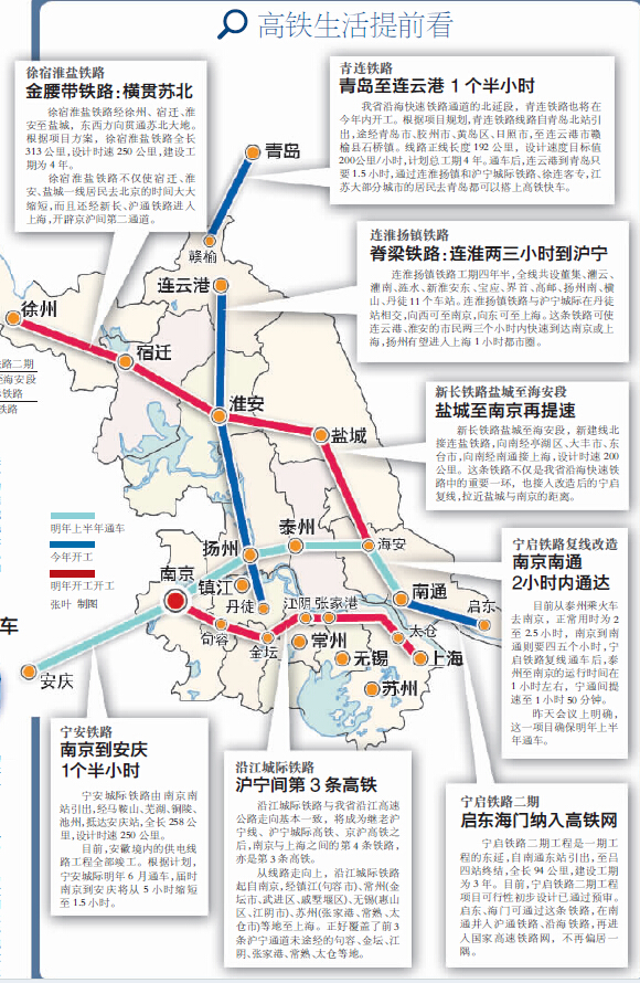 具體時間安排是:連淮揚鎮鐵路、青連鐵路和寧啟鐵路二期今年內開工;明年排定的開工項目包括徐宿淮鹽鐵路、新長鐵路鹽城至海安段改造、符夾線改造工程和沿江城際鐵路;寧啟鐵路復線電氣化改造、寧安鐵路確保明年上半年通車。