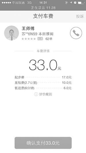 “專車”沒有計價器,計價規則是17元起步費+3.7元/公里+1元/分鐘。這段2.7公里的路程,如果打普通出租車,起步價加燃油附加費是11元。但“專車”是33元,包括17元起步價,2.7公里的費用10元,還有6元的低速費。“專車”也會提供發票,快遞送達。