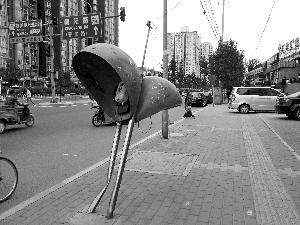 南小市口街的一個電話亭,亭壁被砸的支離破碎,露出尖銳的一角。很多電話亭上貼著“愛護公話”的宣傳語,但電話亭並沒得到應有的保護。