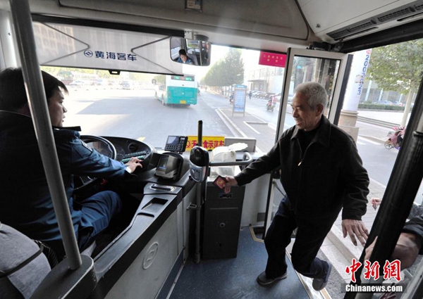 11月4日,石家莊市民免費乘坐公交車。該市人民政府新聞辦公室官方微博稱,據河北省市氣象、環境專家的預測,未來幾天,石家莊空氣質量將達到中度至重度污染。為減緩空氣污染加重,今日零時起,啟動最高一級重污染天氣應急減排措施,機動車實行單雙號限行,全市3733輛公交車開始免費載客。圖為公交車投幣處被堵住。 中新社發 翟羽佳 攝