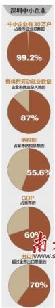 記者在論壇上獲悉,深圳市中小企業從規模上具有兩大特點:一是中小企業在深圳地區數量眾多,目前約有個體工商戶40萬戶、中小企業30萬戶,個體工商戶和私營企業數均位居廣東省之首;二是中小企業在深圳經濟中比重很大,中小企業數量佔全市企業總數的99.2%,提供的勞動就業數量佔全市就業總人數的87%,納稅額佔全市納稅總額的55.6%,GDP佔全市的六成以上,出口量超過全市出口總量的70%。