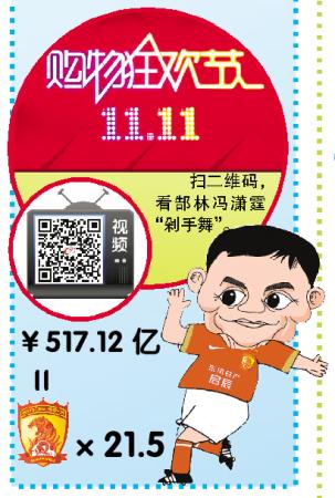 2014年天貓“雙十一”落下帷幕。阿里集團昨日宣布,今年“雙十一”活動支付寶進賬517.12億元,輕松刷新世界單日狂購紀錄。按照廣州恆大淘寶足球俱樂部估值24億元算,僅“雙十一”24小時成交額就相當于約21.5個恆大俱樂部。