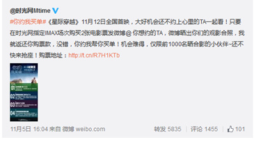 和淘寶電影聯合新浪,或貓眼電影、格瓦拉等“聯合片方”的合作模式不一樣的是,時光網是從院線方斥資千萬包場,再將包場資源打包推薦給特定消費者。因此這次包場活動,是只有時光網用戶才能享受的特權(用戶可以通過時光網購買時光網IMAX專場影票,同時時光網還舉辦了#你約我買單#活動,贈票2000名),共有上萬名時光網用戶參與。除此之外,有超過5萬人次(截止11月14日前)在影片上映前通過時光網提前預訂《星際穿越》電影票,創造了好萊塢大片大規模超前預售的新紀錄。