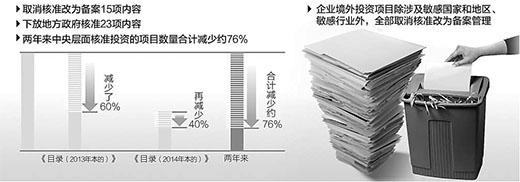 總的來看,《目錄(2014年本)》共取消、下放38項核準權限。經過去年、今年兩次修訂,使得中央層面核準的項目數量合計減少約76%,其中,修訂後的2013年本《核準目錄》,減少了60%;通過今年的再次修訂,在2013年基礎上再減少40%。
