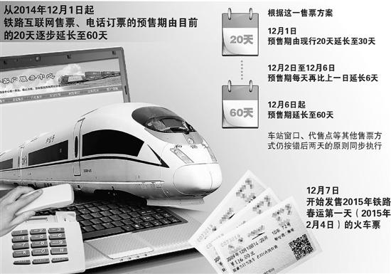 鐵路官方消息,自2014年12月1日起,將用一周的時間,逐步將鐵路互聯網售票、電話訂票的預售期,由目前的20天延長至60天。