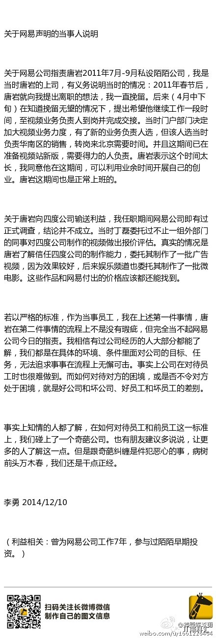 此事,也在圈內引起熱議,就在剛剛,也是網易前總編輯,猿題庫創始人李勇發表公開申明,就相關事實作出回應。