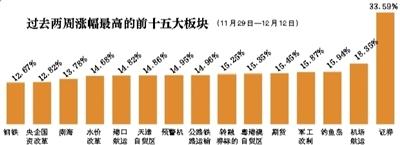 數據顯示,過去兩周(11月29日—12月12日),漲幅最高的前幾大板塊分別是證券、機場航運、釣魚島概念、軍工、期貨、粵港澳自貿區、轉融券標的和公路鐵路運輸。其中,證券股漲幅最高,達到33.59%;公路鐵路運輸板塊的漲幅為14.96%。此外,如鋼鐵板塊、海峽西岸概念股的漲勢,也較為喜人。