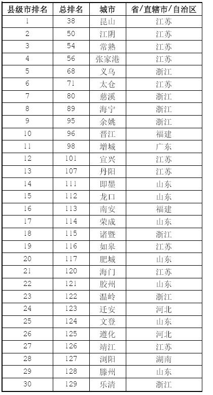 據悉入選縣級城市集中在經濟發達的長三角、珠三角、環渤海地區。其中,江蘇有10個入選;浙江、山東同時有7個入選;河北、福建同時有2個入選;而廣東、湖南則各有1個入選。