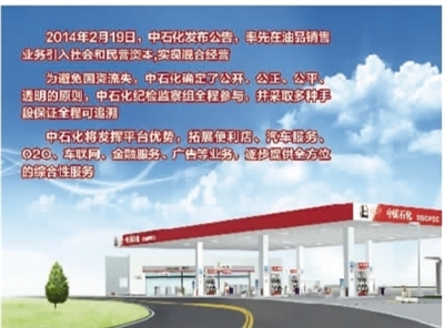 2014年2月19日,中石化率先舉起混合所有制改革的大旗。中石化發布公告稱,率先在油品銷售業務引入社會和民營資本,實現混合經營,授權董事長在社會和民營資本持有銷售公司股權比例不超過30%的情況下,確定投資者、持股比例、參股條款和條件,組織實施該方案及辦理相關程序。