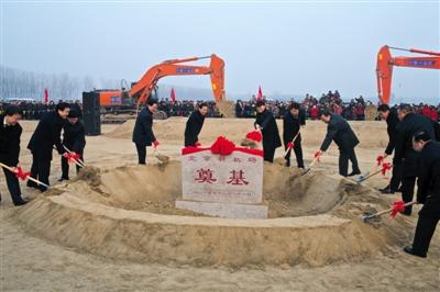 嘉賓為新機場奠基。昨日,首都新機場正式開工,開工區域為機場兩條主跑道西一、西二跑道的北段。新京報記者 周崗峰 攝