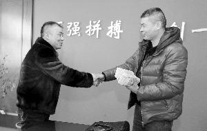 昨天,在鐵心橋派出所,失主濮先生(右)接過陳鷹(左)撿的11萬元現金