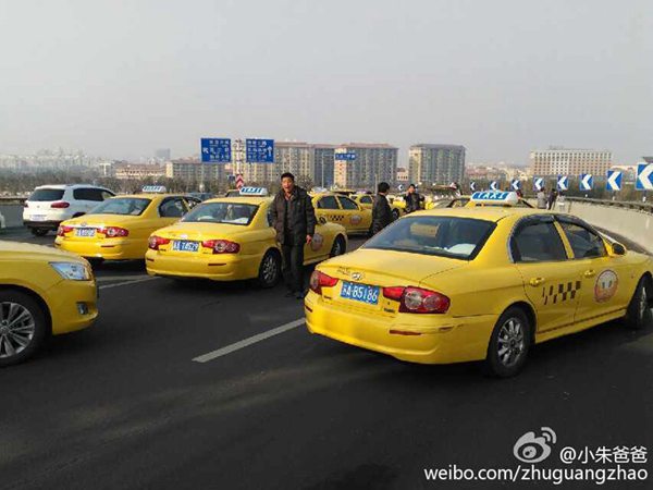 1月8日下午,高鐵南京南站地區發生部分出租車罷運現象,一度造成乘客滯留。多位南京出租車駕駛員向記者證實,每月高達7000元乃至9000元的份子錢讓他們不堪重負,“每天一睜眼就欠公司200多塊”,這迫使他們通過罷運來表達希望“減租子”的群體訴求。圖為罷運現場。