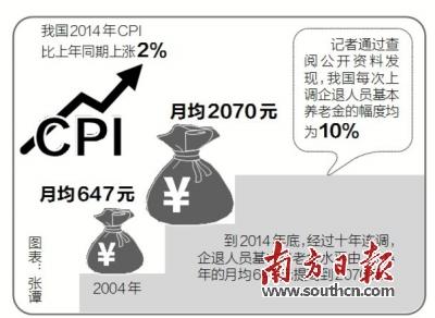 國家統計局發布的數據顯示,我國2014年CPI比上年同期上漲2%。到2014年底,經過十年連調,企退人員基本養老金水平由2004年的月均647元提高到2070元。記者通過查閱公開資料發現,我國每次上調企退人員基本養老金的幅度均為10%,而同期CPI增幅均遠遠低于這一數字。