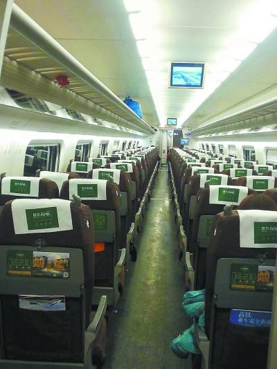 坐在略顯空蕩的車廂里,乘客的咳嗽聲、哈欠聲都聽得很清楚。7點10分左右,乘務員進行下車前的準備,匯報這趟列車共355位乘客。相較于一千多張座位來說,上座率只有三成多一點。